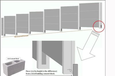 If the fence line is shorter or smooth the best way is to set first post and some 2x4 on the end to provide the same height and put the rope line on top. Because of the slop one side always is going to be lower and will not have the bottom support, so we cut that missing piece (2x2 by height are the difference is) from a 8x16 building cement block. Put that piece on the lower side into post channel to provide the panels level. You can also put some brick under the lower side of the panel and some concrete around to secure it.